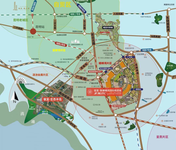 在昆明“南延北拓”的规划中,新螺蛳湾片区高铁、地铁等城市公共设施和重大基础设施建设完善,将成为相对独立、功能完善、环境优美、交通便捷、公共服务发达的现代化城区。新螺蛳湾区域发展醇熟,人口基数大,人流量多、路网发达,是链接两大区的核心枢纽,最大限度的享受两大区发展红利,将成为昆明未来新中心。凭借超大体量和超高的商贸交易额以及大型国际性配套成功带动周边区域发展,成为云南商贸物流“大据点”,成为云南面向世界的又一道窗口。